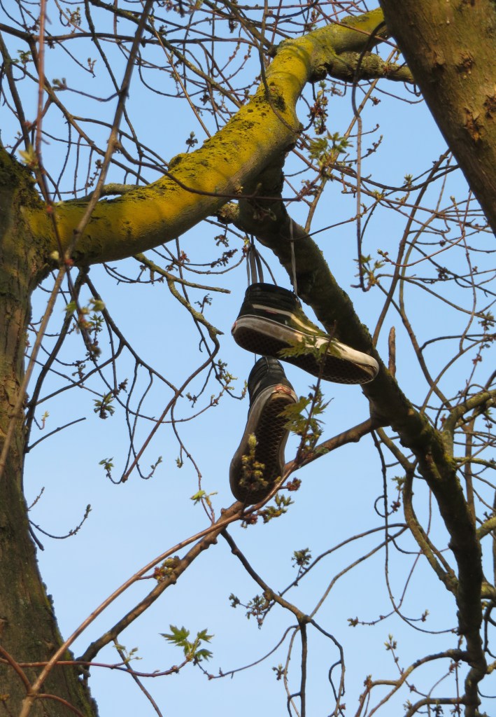 Why assume that people threw these shoes ‘up’ to catch by their laces on the branches of this tree? Why not assume that people dropped the shoes from a passing plane or hot air balloon? That a murder of marauding crows raided a track and field event and dropped their weighty shoe-booty in order to beat a speedy get away. Or that the soulless shoes dropped from the feet of people lifted by the rapture?